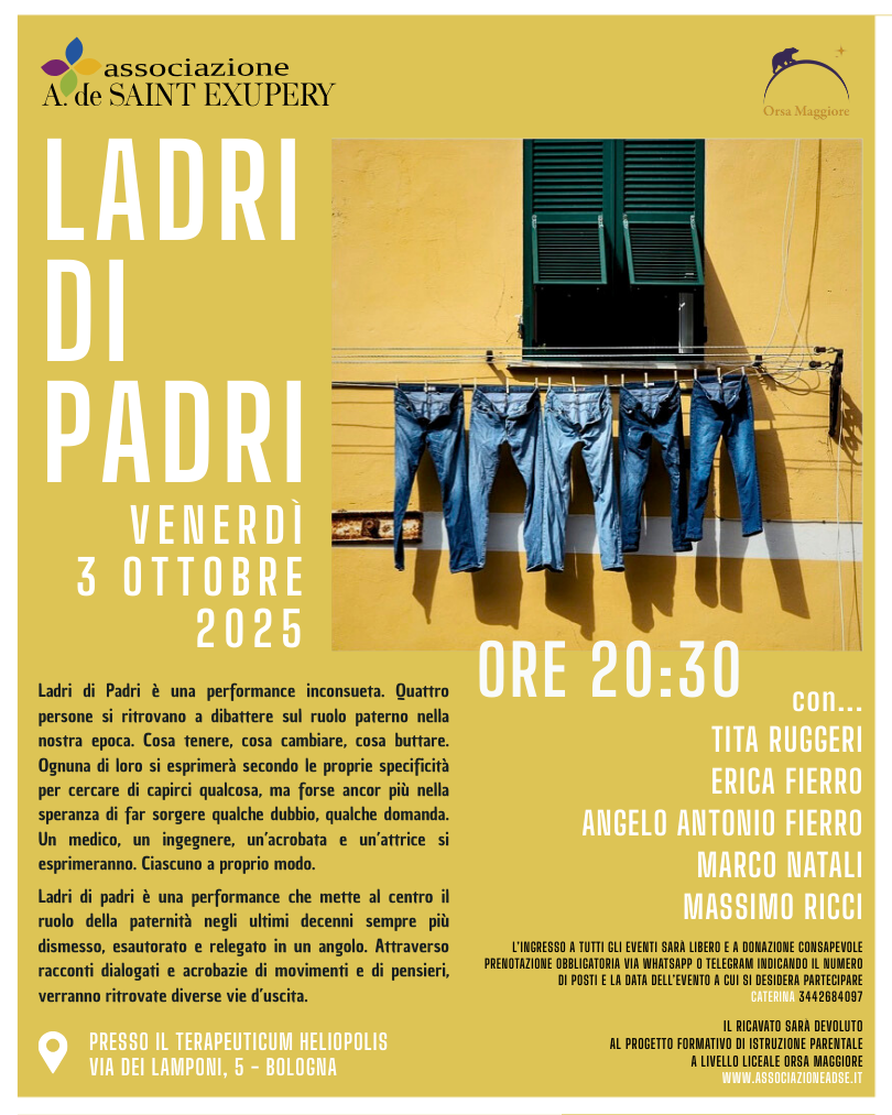 Ladri di padri è una performance che mette al centro il ruolo della paternità negli ultimi decenni sempre più dismesso, esautorato e relegato in un angolo. Attraverso racconti dialogati e acrobazie di movimenti e di pensieri, verranno ritrovate diverse vie d’uscita.